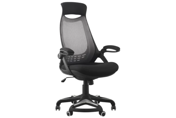 Priestranné sedenie spríjemňuje moderný dizajn zaobleného tvarovaného kresla. Potiahnuté kombináciou čiernej a šedej sieťoviny.