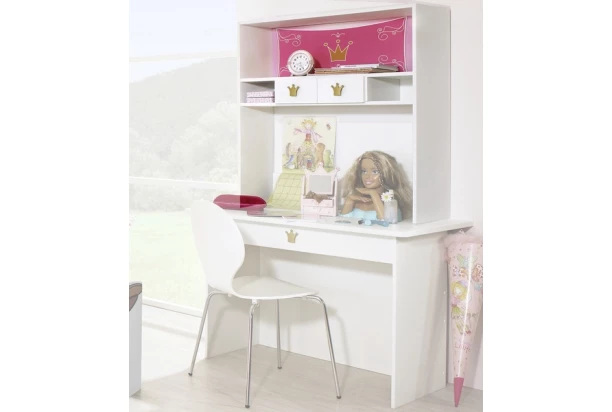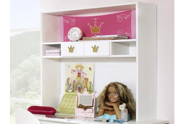 Úložný nadstavec na písací stôl z detskej kolekcie Kate si zamilujú malé i veľké princezné. Nábytok s ružovými aplikáciami a motívom princeznovskej koruny je skvelou inšpiráciou pre zariadenie detskej izby pre dievčatá. Doprajte tak svojim deťom prežiť si svoj sen v ich vlastnom detskom kráľovstve.