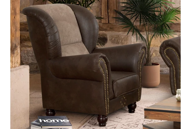 Kreslo ušiak v noblesnom štýle je veľmi veľmi obľúbené a zaujme na pohľad. Komfortné vysoké operadlo dopĺňajú masívne tvarované nohy a okrasné kovové cvočky, ktoré dotvárajú jedinečný vzhľad. Toto štýlové kreslo je očalúnené kombináciou hnedá látka vo vintage optike kože a béžová látka s mäkkučkou štruktúrou.