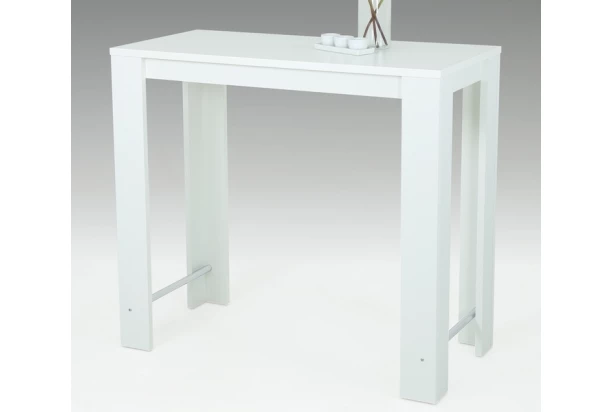 Vysoký barový stôl s optikou širokých rámov môže byť umiestnený do priestoru alebo priamo k stene. Vyrobený v bielom prevedení.