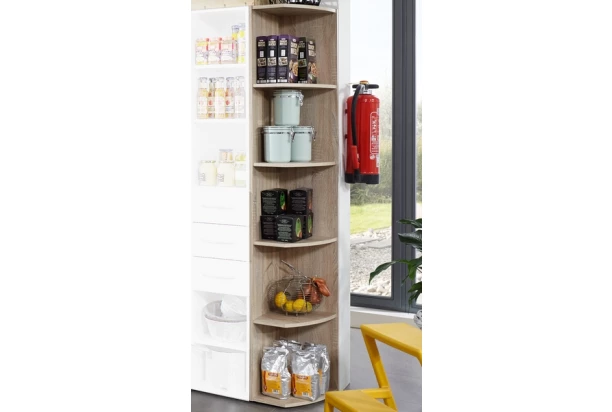 Rohový regál s výškou 185 cm v dekore dub sonoma z viacúčelového programu Multiraum. Kombinovaním rôznych dielov môžete ľahko zariadiť akúkoľvek miestnosť vášho bytu.