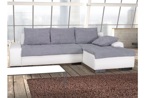 Relaxačná sedacia súprava vyniká širokým sedákom a ponúka tak veľa miesta pre chvíle lenošenia. Biela ekokoža kombinovaná mäkkou, šedou látkou.