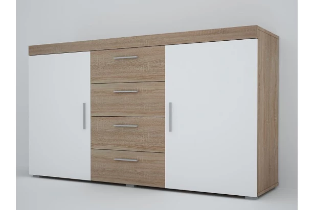 Komoda v jemne zladených odtieňoch presvetlí interier. Kombinácia dekoru rezaný dub s bielymi plochami. Široký horný rám zvýrazňuje línie.