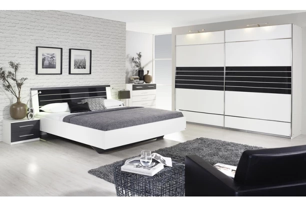 Šatníková skriňa z kolekcie Nienburg v šedo-bielej kombinácii pre zariadenia modernej a nadčasovej spálne. Zrkadlové a temne šedé pruhy skla dotvárajú na posuvných dverách luxusný efekt.