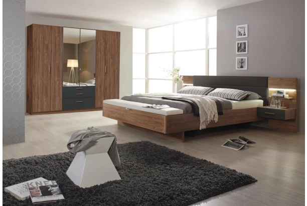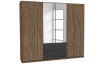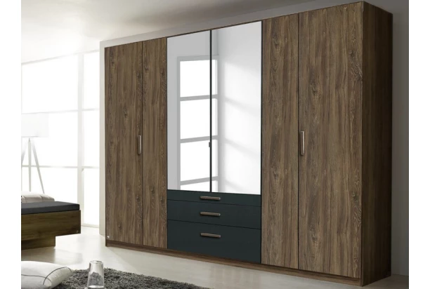 Moderná šatníková skriňa s otočnými dverami z dizajnovej kolekcie Mosbach v kombinácii duba stirling, šedej farby a zrkadla. Oceníte kvalitné spracovanie i praktické úložné priestory.