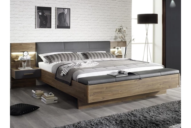 Moderná posteľ s nočnými stolíkmi z dizajnovej kolekcie Mosbach je vyrobená v kombinácii útulného drevodekoru dub Stirling a čalúneného čela, navyše pôsobia veľmi luxusne. Zadné čalúnené čelo vybavené LED osvetlením a predná čalúnená lavica obsahuje praktický úložný priestor pre uschovanie lôžkovín. Oceníte kvalitné spracovanie aj výnimočnú optiku.