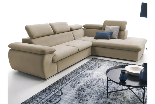 Atraktívna rohová sedacia súprava s otomanom vpravo a polohovateľnými chrbtovými opierkami. Očalúnená príjemne mäkkou látkou vo farbe svetlo béžová. Zaujme moderným dizajnom zaoblených tvarov a poteší kvalitným vypolstrováním, pre Váš každodenný komfort. Sedačka je navyše vybavená funkciou rozkladu, pre príležitostné spanie s praktickým úložným priestorom pod otomanom – získate tak ďalšie miesto pre ukladanie vecí.
