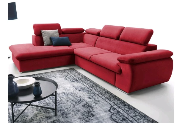 Atraktívna rohová sedacia súprava s otomanom vľavo a polohovateľnými chrbtovými opierkami. Očalúnená príjemne mäkkou látkou vo farbe červená. Zaujme moderným dizajnom zaoblených tvarov a poteší kvalitným vypolstrováním, pre Váš každodenný komfort. Sedačka je navyše vybavená funkciou rozkladu, pre príležitostné spanie i praktickým úložným priestorom pod otomanom – získate tak ďalšie miesto pre ukladanie vecí.