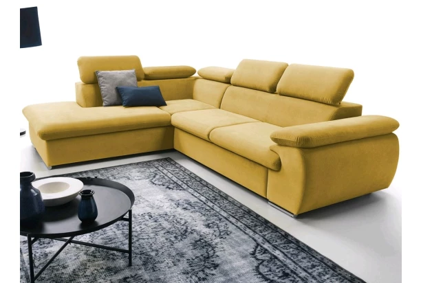 Atraktívna rohová sedacia súprava s otomanom vľavo a polohovateľnými chrbtovými opierkami. Očalúnenie príjemne mäkkou látkou vo farbe žltá. Zaujme moderným dizajnom zaoblených tvarov a poteší kvalitným vypolstrováním pre Váš každodenný komfort. Sedačka je navyše vybavená funkciou rozkladu pre príležitostné spanie i praktickým úložným priestorom pod otomanom – získate tak ďalšie miesto pre ukladanie vecí.