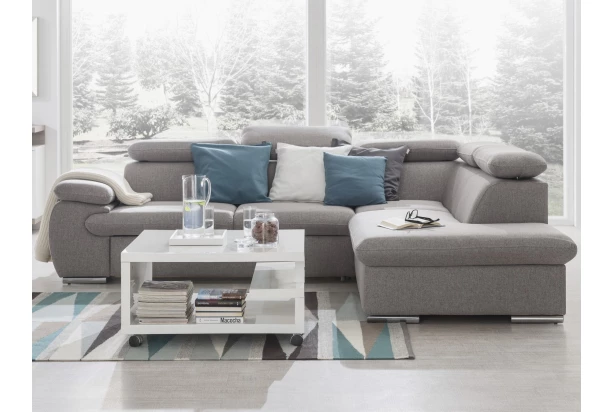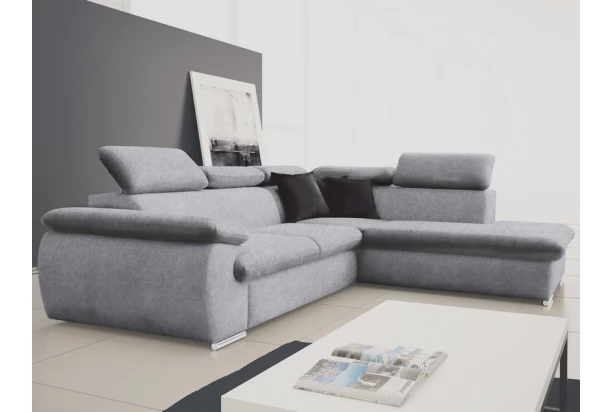 Atraktívne svetlo šedá rohová sedačka s otomanom vpravo a polohovateľnými chrbtovými opierkami zaujme dizajnom moderných zaoblených tvarov. Vybavená funkciou rozkladu pre príležitostné spanie i praktickým úložným priestorom.