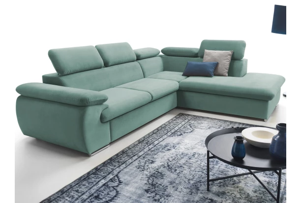Atraktívna rohová sedacia súprava s otomanom vpravo a polohovateľnými chrbtovými opierkami. Očalúnenie príjemne mäkkou látkou vo farbe mentolovo zelená. Zaujme moderným dizajnom zaoblených tvarov a poteší kvalitným vypolstrováním pre Váš každodenný komfort. Sedačka je navyše vybavená funkciou rozkladu pre príležitostné spanie i praktickým úložným priestorom pod otomanom – získate tak ďalšie miesto pre ukladanie vecí.