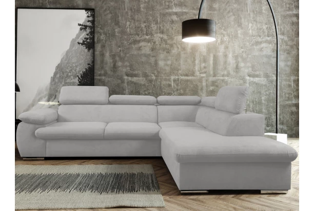 Atraktívna rohová sedacia súprava s otomanom vpravo a polohovateľnými chrbtovými opierkami. Očalúnená mäkkou štruktúrovanou látkou vo farbe svetlo šedá. Zaujme moderným dizajnom zaoblených tvarov a poteší kvalitným vypolstrovaním pre Váš každodenný komfort. Sedačka je navyše vybavená funkciou rozkladu na príležitostné spanie aj praktickým úložným priestorom pod otomanom – získate tak ďalšie miesto na ukladanie vecí.
