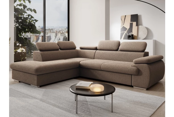 Atraktívna rohová sedacia súprava s otomanom vľavo a polohovateľnými chrbtovými opierkami. Očalúnená príjemne mäkkou látkou vo farbe svetlo hnedá. Zaujme moderným dizajnom zaoblených tvarov a poteší kvalitným vypolstrovaním pre Váš každodenný komfort. Sedačka je navyše vybavená funkciou rozkladu na príležitostné spanie aj praktickým úložným priestorom pod otomanom – získate tak ďalšie miesto na ukladanie vecí.