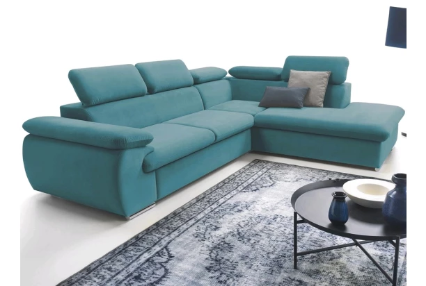 Atraktívna rohová sedacia súprava s otomanom vpravo a polohovateľnými chrbtovými opierkami. Očalúnená príjemne mäkkou látkou vo farbe petrolejová. Zaujme moderným dizajnom zaoblených tvarov a poteší kvalitným vypolstrováním pre Váš každodenný komfort. Sedačka je navyše vybavená funkciou rozkladu pre príležitostné spanie i praktickým úložným priestorom pod otomanom – získate tak ďalšie miesto pre ukladanie vecí.