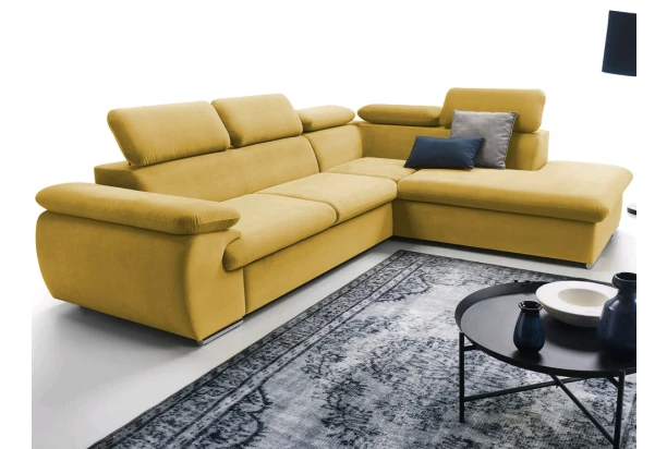 Atraktívna rohová sedacia súprava s otomanom vpravo a polohovateľnými chrbtovými opierkami. Očalúnená príjemnou mäkkou látkou vo farbe žltá. Zaujme moderným dizajnom zaoblených tvarov a poteší kvalitným vypolstrováním, pre Váš každodenný komfort. Sedačka je navyše vybavená funkciou rozkladu pre príležitostné spanie i praktickým úložným priestorom pod otomanom – získate tak ďalšie miesto pre ukladanie vecí.