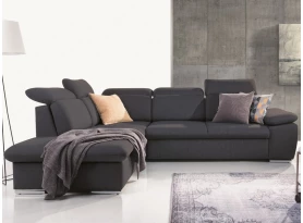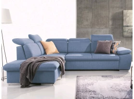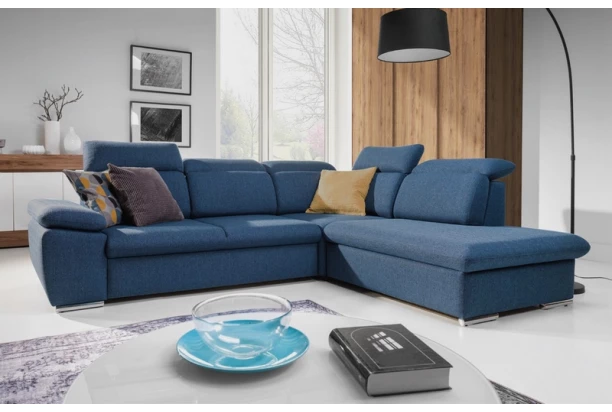 Elegantná rohová sedacia súprava s komfortne mäkkým sedením a polohovateľnými opierkami hlavy ponúka skvelé pohodlie i praktickosť. Variant s otomanom vpravo. Očalúnená tkaninou v odtieni denimovo modrá.