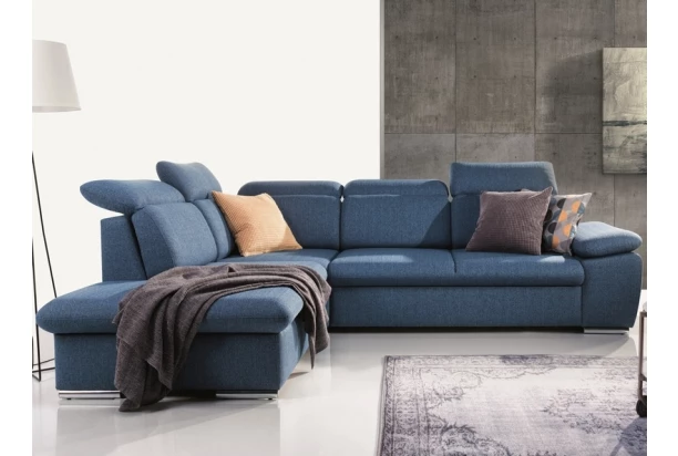 Elegantná rohová sedacia súprava s komfortne mäkkým sedením a polohovateľnými opierkami hlavy ponúka skvelé pohodlie i praktickosť. Variant s otomanom vľavo. Očalúnená tkaninou v odtieni denimovo modrá.