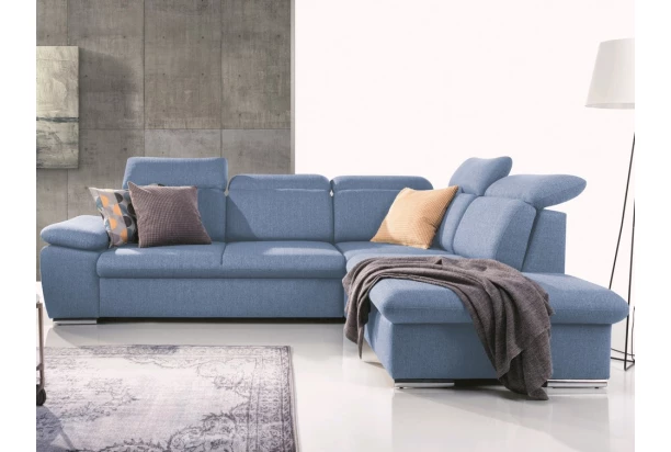 Elegantná rohová sedacia súprava s komfortne mäkkým sedením a polohovateľnými opierkami hlavy, ponúka skvelé pohodlie i praktickosť. Variant sedačky s otomanom vpravo. Očalúnená tkaninou v modrom odtieni.