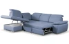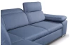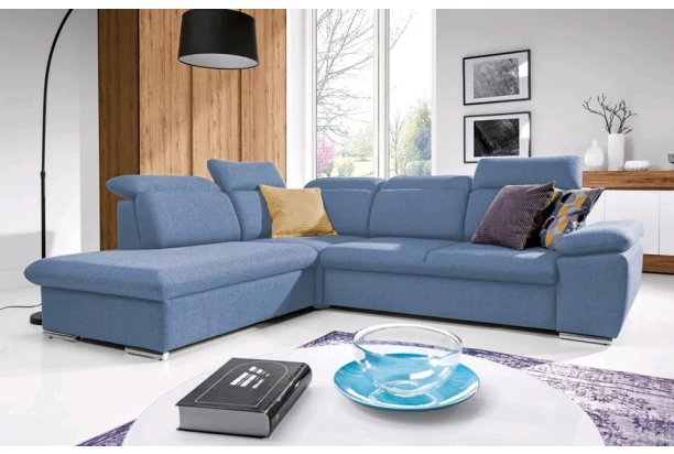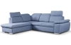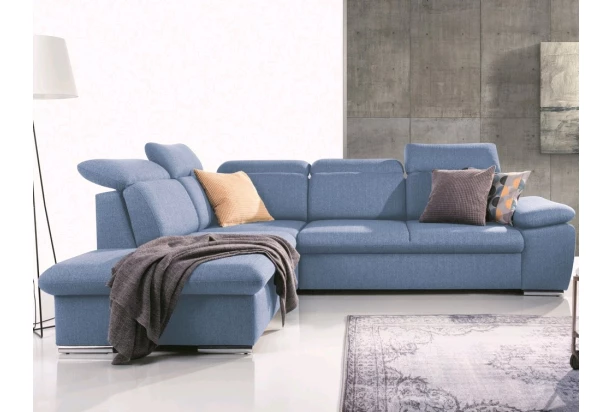 Elegantná rohová sedacia súprava s komfortne mäkkým sedením a polohovateľnými opierkami hlavy, ponúka skvelé pohodlie i praktickosť. Variant s otomanom vľavo. Očalúnená tkaninou v modrom odtieni.