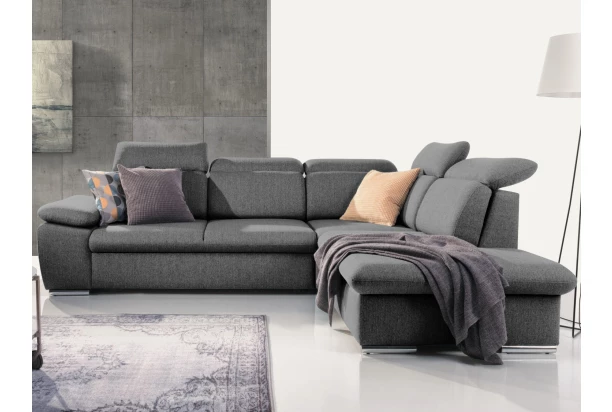 Elegantná rohová sedačka s komfortne mäkkým sedením a polohovateľnými opierkami hlavy ponúka skvelé pohodlie aj praktickosť. Variant sedačky s otomanom umiestneným vpravo tvorí pravý roh. Sedacia súprava je očalúnená látkou vo farbe dymovo šedá, ktorá je mäkká na dotyk a vyznačuje sa jemnou štruktúrou s vysokou hustotou vlákien. Okrem príjemného pohodlia oceníte aj praktický úložný priestor pod otomanom alebo funkciu rozkladu pre príležitostné spanie alebo domácu relaxáciu. Táto obľúbená sedačka so zaoblenými tvarmi sa tak hodí takmer do každej obývačky.