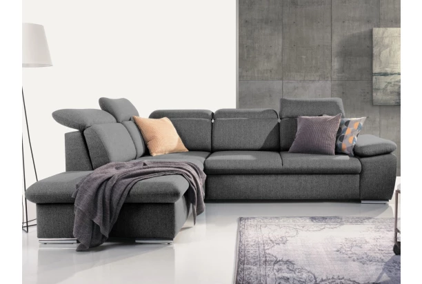 Elegantná rohová sedačka s komfortne mäkkým sedením a polohovateľnými opierkami hlavy ponúka skvelé pohodlie aj praktickosť. Variant sedačky s otomanom umiestneným vľavo tvorí ľavý roh. Sedacia súprava je očalúnená látkou vo farbe dymovo šedá, ktorá je mäkká na dotyk a vyznačuje sa jemnou štruktúrou s vysokou hustotou vlákien. Okrem príjemného pohodlia oceníte aj praktický úložný priestor pod otomanom alebo funkciu rozkladu pre príležitostné spanie alebo domácu relaxáciu. Táto obľúbená sedačka so zaoblenými tvarmi sa tak hodí takmer do každej obývačky.