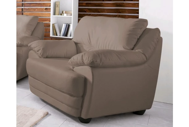 Pohodlne nadýchaný sedák poskytuje výborný komfort sedenia a elegantne zaoblené tvary kresla lahodia oku. Poťah v sivo-hnedej látke, ktorá optikou pripomína brúsenú kožu.