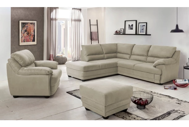 Pohodlne nadýchané vypolstrovanie sedačky poskytuje výborný komfort počas sedenia a elegantný dizajn zaoblených tvarov sa hodí do moderného aj klasicky zariadeného interiéru. Rohová sedacia súprava je očalúnená látkou v odtieni béžová latté a s otomanom vytvára ľavý roh. Sedačku ľahko premeníte na lôžko na príležitostné spanie vďaka funkcii rozkladu.