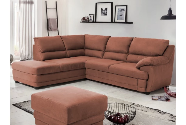 Pohodlne nadýchané vypolstrovanie sedačky poskytuje výborný komfort počas sedenia a elegantný dizajn zaoblených tvarov sa hodí do moderného aj klasicky zariadeného interiéru. Rohová sedacia súprava je očalúnená látkou v odtieni medená hrdzavá a s otomanom vytvára ľavý roh. Sedačku ľahko premeníte na lôžko na príležitostné spanie vďaka funkcii rozkladu.