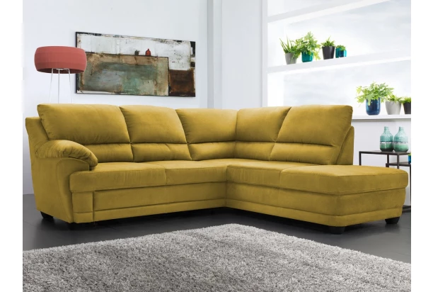 Pohodlne nadýchané vypolstrovanie sedačky poskytuje výborný komfort počas sedenia a elegantný dizajn zaoblených tvarov sa hodí do moderného aj klasicky zariadeného interiéru. Rohová sedacia súprava je očalúnená látkou v odtieni žltej karí a s otomanom vytvára pravý roh. Sedačku ľahko premeníte na lôžko na príležitostné spanie vďaka funkcii rozkladu.