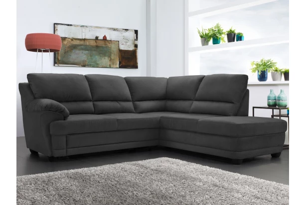 Pohodlne nadýchané vypolstrovanie sedačky poskytuje výborný komfort počas sedenia a elegantný dizajn zaoblených tvarov sa hodí do moderného aj klasicky zariadeného interiéru. Rohová sedacia súprava je očalúnená látkou v odtieni antracitová šedá a s otomanom vytvára pravý roh. Sedačku ľahko premeníte na lôžko na príležitostné spanie vďaka funkcii rozkladu.