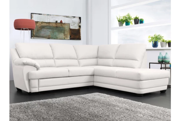 Pohodlne nadýchané vypolstrovanie sedačky poskytuje výborný komfort počas sedenia a elegantný dizajn zaoblených tvarov sa hodí do moderného aj klasicky zariadeného interiéru. Rohová sedacia súprava je očalúnená pravou kožou vo farbe biela a s otomanom vytvára pravý roh. Sedačku ľahko premeníte na lôžko na príležitostné spanie vďaka funkcii rozkladu.