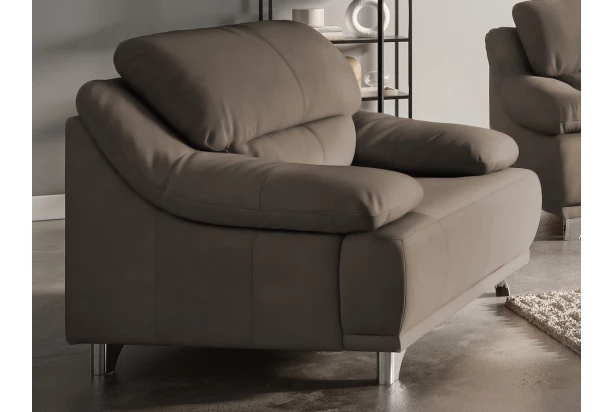 Luxusnú eleganciu a komfortne mäkké pohodlie si môžete vychutnávať s týmto atraktívnym kreslom. Nadýchaný sedák v vankúšovej optike je potiahnutý pravou kožou vo farbe blatistá hnedo-béžová. Kreslo má elegantný dizajn zaoblených tvarov, ktorý dotvára kovové nohy v chrómovo lesklom prevedení.
