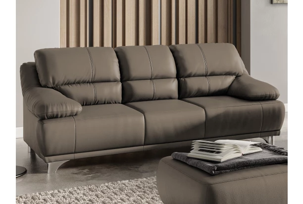 Luxusnú eleganciu a komfortne mäkké pohodlie si môžete vychutnávať s touto atraktívnou trojmiestnou pohovkou. Nadýchané sedáky v vankúšovej optike sú potiahnuté pravou kožou vo farbe blatistá hnedo-béžová. Pohovka má elegantný dizajn zaoblených tvarov, ktorý dotvára kovové nohy v chrómovo lesklom prevedení.