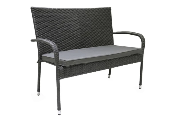 Záhradná lavica s vankúšom a opierkami je vyrobená z kombinácie kovu a odolnej imitácie šedého ratanu.