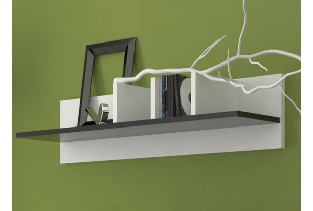 Jednoduchá polička v bielo-čiernom kontrastnom prevedení môže byť zavesená samostatne alebo ako súčasť obývacej zostavy.