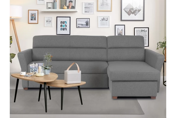 Priamočiare línie a zaujímavo skosené tvary podrúčiek dávajú tejto sedačke moderný charakter. Variant rohovej sedacej súpravy s otomanom vpravo je očalúnený látkou vo farbe dymovo šedá. Oceníte aj funkciu rozkladu a úložný priestor.