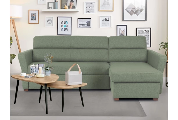 Priamočiare línie a zaujímavo skosené tvary podrúčiek, dávajú tejto sedačke moderný charakter. Variant rohovej sedacej súpravy s otomanom vpravo je očalúnený látkou vo farbe rákosovo zelená. Oceníte aj funkciu rozkladu a úložný priestor.