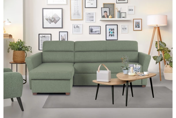 Priamočiare línie a zaujímavo skosené tvary podrúčiek ,dávajú tejto sedačke moderný charakter. Variant rohovej sedacej súpravy s otomanom vľavo je očalúnený látkou vo farbe rákosovo zelená. Oceníte aj funkciu rozkladu a úložný priestor.