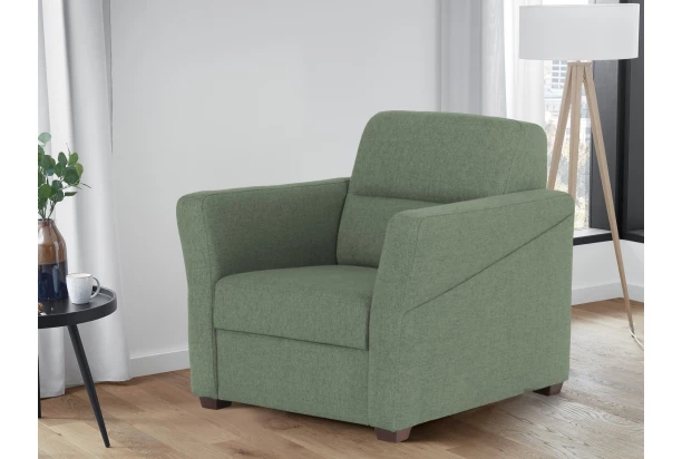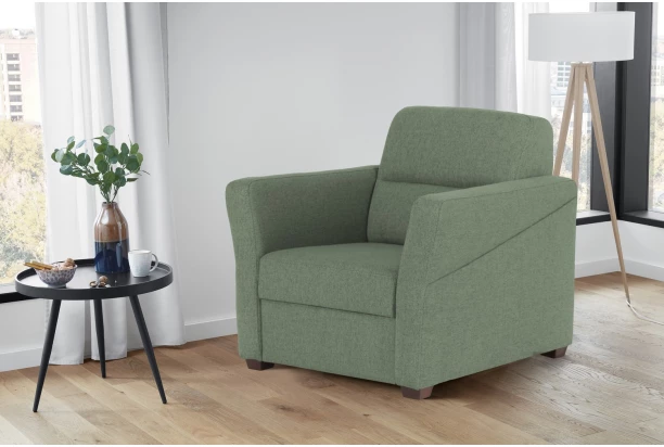 Priamočiare línie a zaujímavo skosené tvary podrúčiek dávajú tomuto kreslu moderný charakter. Očalúnené látkou vo farbe rákosovo zelená.