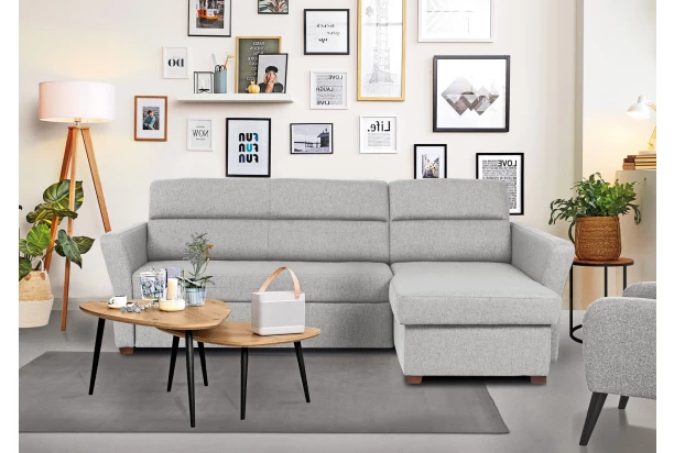 Priamočiare línie a zaujímavo skosené tvary podrúčiek dávajú tejto sedačke moderný charakter. Variant rohovej sedacej súpravy s otomanom vpravo tvorí pravý roh je očalúnená látkou vo farbe svetlo šedá. Oceníte úložný priestor a funkciu rozkladu na príležitostné aj trvalé spanie.