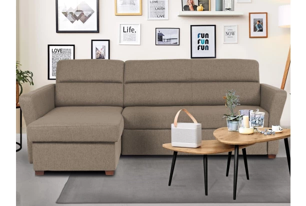 Priamočiare línie a zaujímavo skosené tvary podrúčiek dávajú tejto sedačke moderný charakter. Variant rohovej sedacej súpravy s otomanom vľavo tvorí ľavý roh je očalúnená látkou vo farbe svetlo hnedá. Oceníte úložný priestor a funkciu rozkladu na príležitostné aj trvalé spanie.