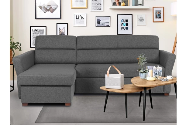 Priamočiare línie a zaujímavo skosené tvary podrúčiek dávajú tejto sedačke moderný charakter. Variant rohovej sedacej súpravy s otomanom vľavo tvorí ľavý roh je očalúnená látkou vo farbe tmavo šedá. Oceníte úložný priestor a funkciu rozkladu na príležitostné aj trvalé spanie.