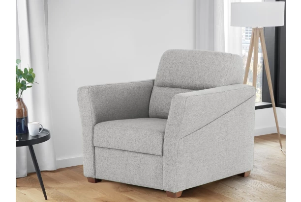 Priamočiare línie a zaujímavo skosené tvary podrúčiek dávajú tomuto kreslu moderný charakter. Očalúnené látkou vo farbe svetlo šedá.