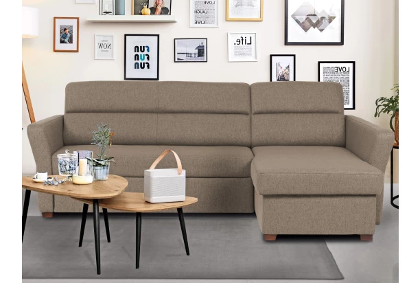 Priamočiare línie a zaujímavo skosené tvary podrúčiek dávajú tejto sedačke moderný charakter. Variant rohovej sedacej súpravy s otomanom vpravo tvorí pravý roh je očalúnená látkou vo farbe svetlo hnedá. Oceníte úložný priestor a funkciu rozkladu na príležitostné aj trvalé spanie.