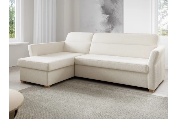 Priamočiare línie a zaujímavo skosené tvary podrúčiek dávajú tejto sedačke moderný charakter. Variant rohovej sedacej súpravy s otomanom vľavo tvorí ľavý roh je očalúnená mäkko štruktúrovanou látkou vo farbe svetlo béžová. Oceníte úložný priestor a funkciu rozkladu na príležitostné aj trvalé spanie.