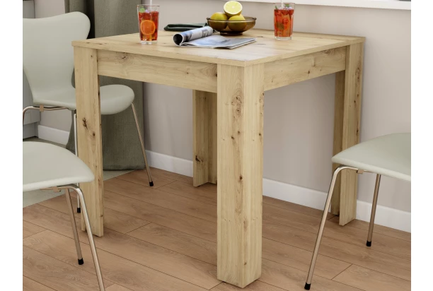 Jedálenský stôl v štvorcovom tvare o veľkosti 80×80 cm sa zmestí aj do menšej jedálne alebo kuchynského kúta. Oceníte univerzálny štýl a pevnú konštrukciu stola, ktorý je vyrobený v dekore dub artisan.