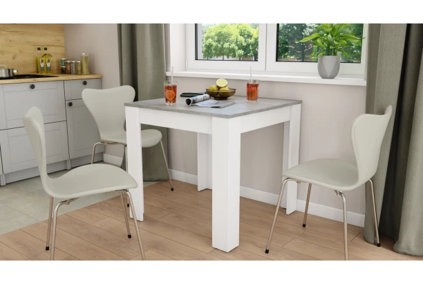 Jedálenský stôl v štvorcovom tvare o veľkosti 80×80 cm sa zmestí aj do menšej jedálne alebo kuchynského kúta. Oceníte univerzálny štýl a pevnú konštrukciu stola, ktorý je vyrobený v prevedení biely/imitácia šedý betón.