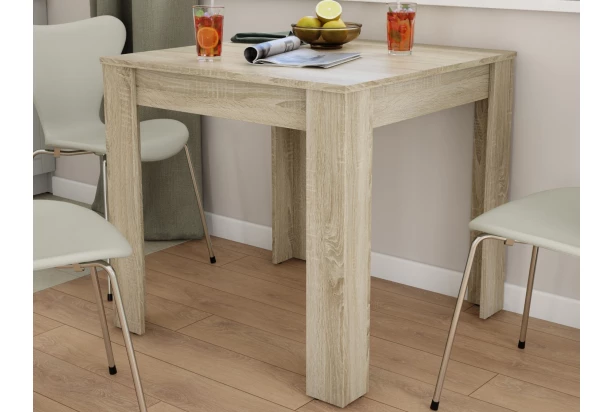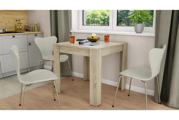 Jedálenský stôl v štvorcovom tvare o veľkosti 80×80 cm sa zmestí aj do menšej jedálne alebo kuchynského kúta. Oceníte univerzálny štýl a pevnú konštrukciu stola, ktorý je vyrobený v dekore dub sonoma.