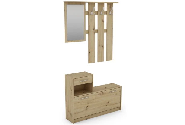 Klasická predsieňová stena obsahuje malý botník, závesný panel so zrkadlom, odkladaciu priehradku aj úložnú zásuvku na drobnosti. V dekore dub artisan.