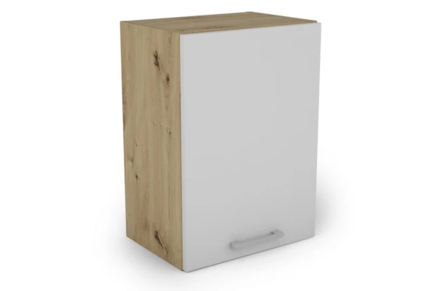 Horná 1-dverová kuchynská skrinka so šírkou 40 cm dokonale dopĺňa funkčný priestor menšej kuchyne. Nábytok vyrobený v kombinácii dekoru dub artisan a bielej farby.